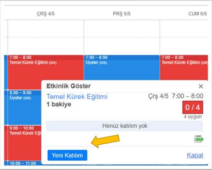 4.Adım: İstediğiniz Gün ve Saati seçerek yeni katılım oluşturabilirsiniz. Yeni başlayanlar antrenman saatine rezervasyon oluştururken “temel ders #” şeklinde seviyelerini belirtir, ilk 10 dersten sonra tecrübeli seviyesi ile devam eder.