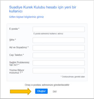 2.Adım: Yeni hesap oluştur tıklanır, sonrasında tüm bilgileri eksiksiz ve doğru bir şekilde doldurulup, oluştur butonuna tıklanır. Sisteme kayıt olduğunuzda yüzme bildiğinizi ve kürek sporu yapmak için herhangi bir sağlık probleminizin olmadığını kabul etmiş ve sorumluluğu almış olursunuz.